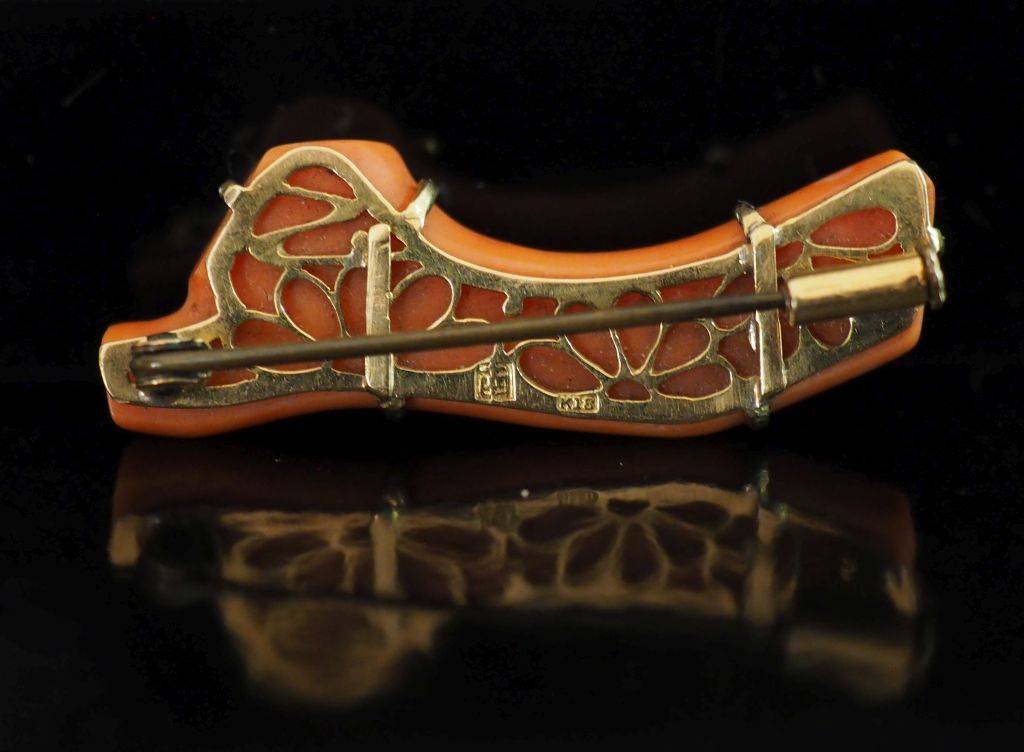 Broche en or jaune 750 et corail. Long. 4 cm Poids tel. 6,98 g (pique en métal)