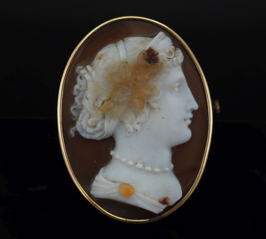 Broche en or jaune 750, sertie d'un camée figurant une jeune femme à la coiffe de profil. 4,5 x 3,3 cm Poids tel. 15,16 g (à charge de contrôle)