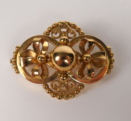Broche en or jaune à décor de nœuds, perles et entrelacs. Poids : 5,2 g