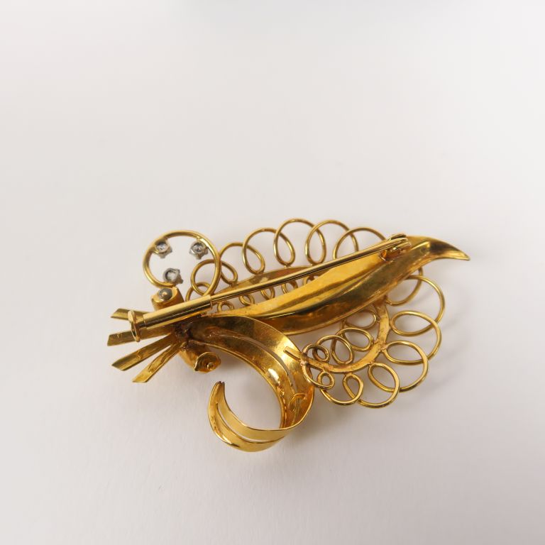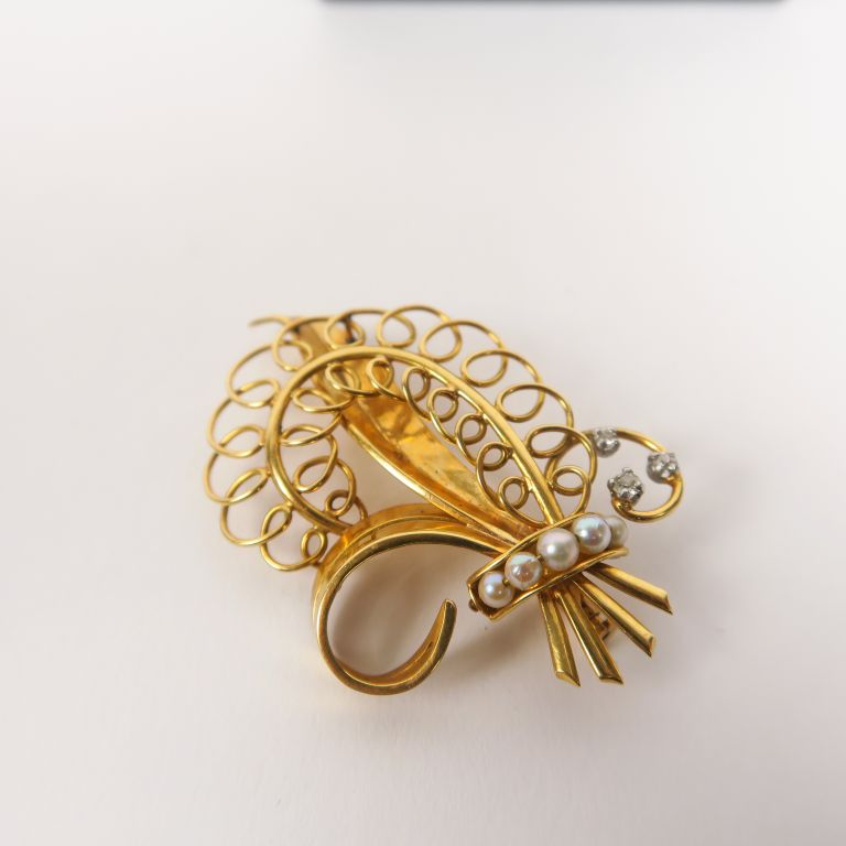 Broche en or jaune en forme de fleur ornée de cinq perles et de trois petits brillants. Poids tel. 10 g