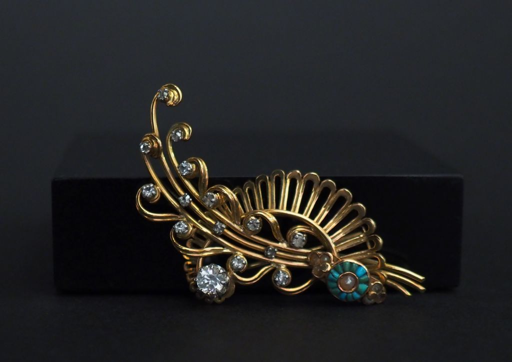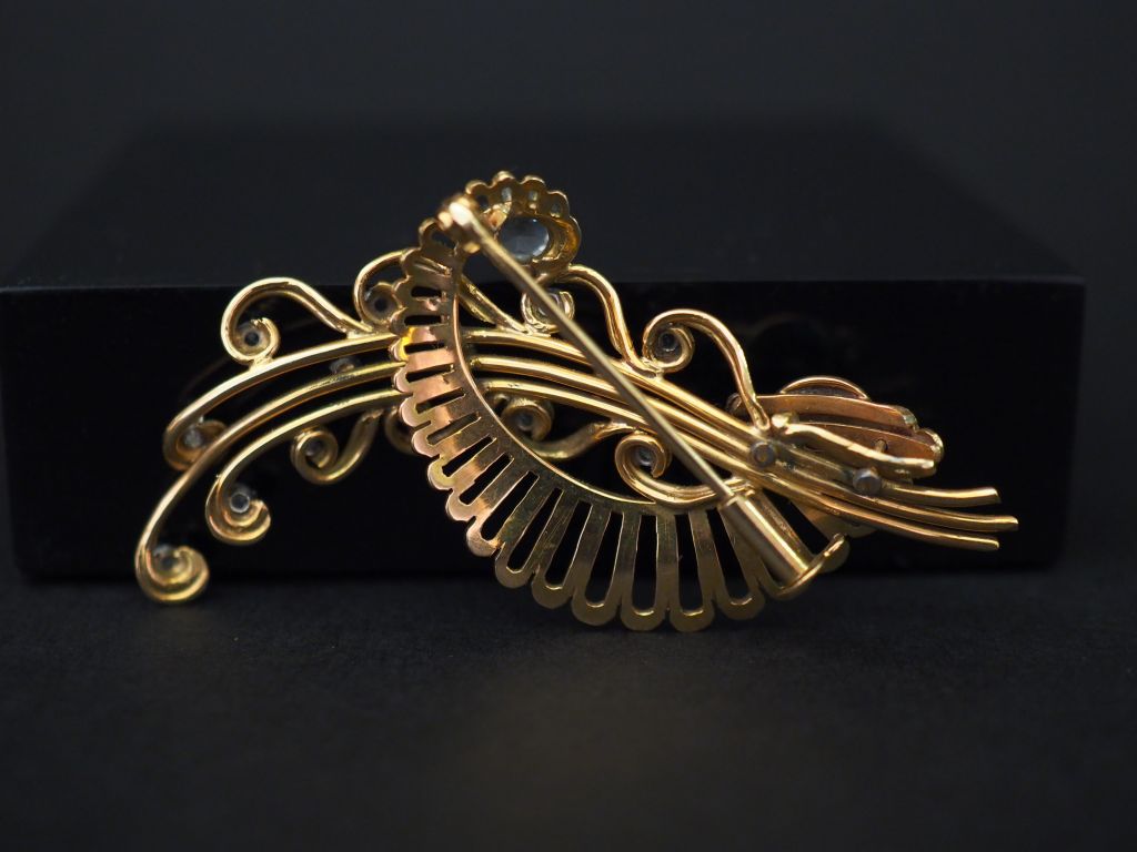 Broche en or jaune, en forme de tiges fleurie enrubannée, sertie de six petits éclats de diamants, petits turquoises, perles et pierres à l’imitation du diamants. Long. 5,6 cm Poids tel. 11,12 g (manques)