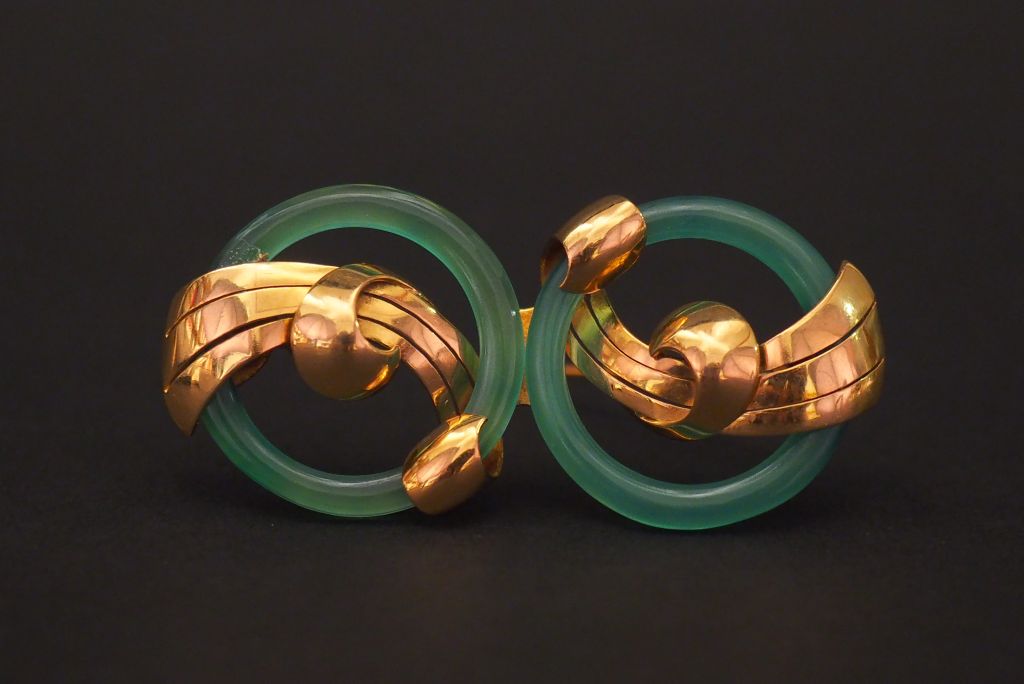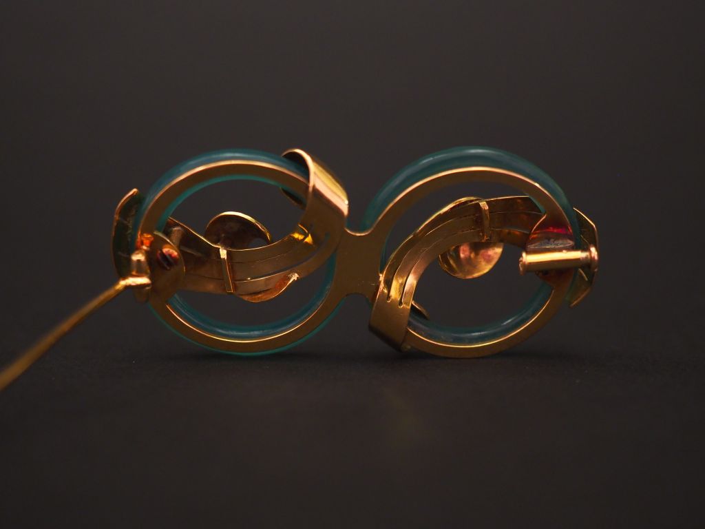 Broche en or jaune et verre, formé de deux cercles entrelacés de motifs stylisés. Long. 5,7 cm Poids tel. 14,72 g