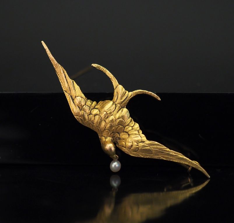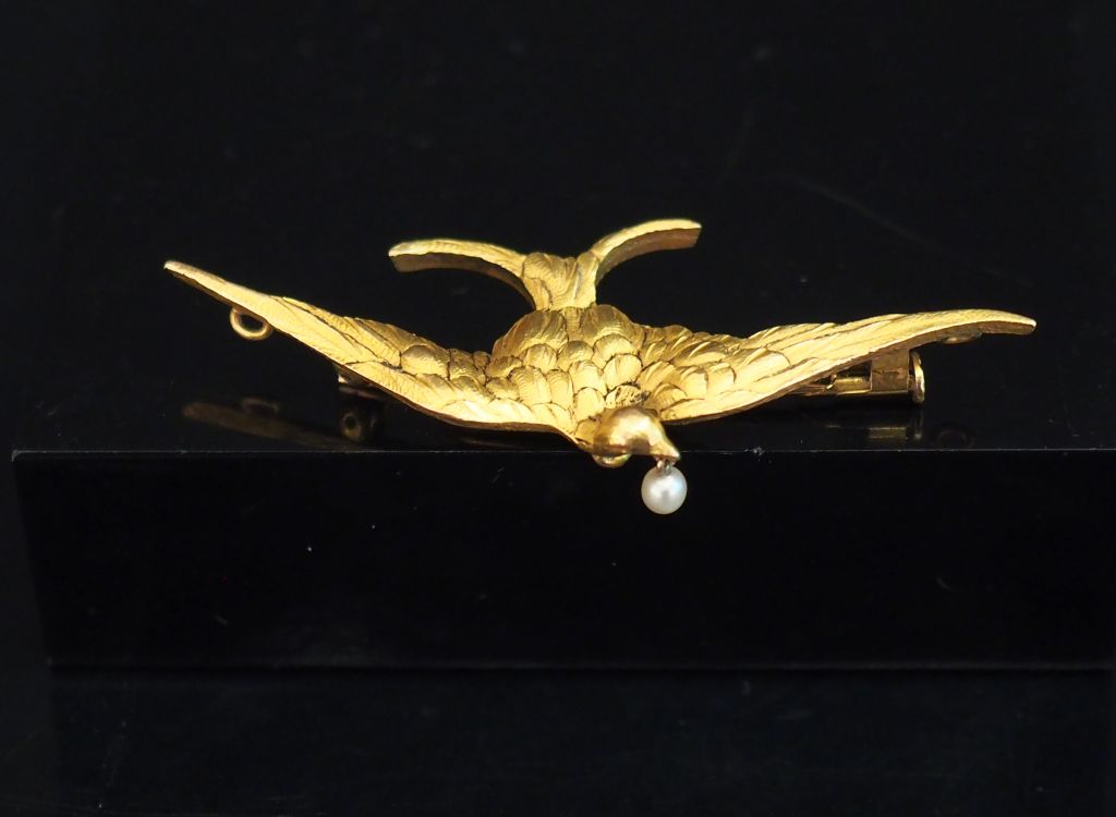 Broche en or jaune, figurant un oiseau aux ailes déployées tenant dans son bec une perle. 2,4 x 5,7 cm Poids tel. 6,37 g