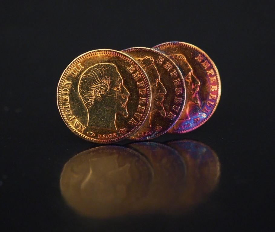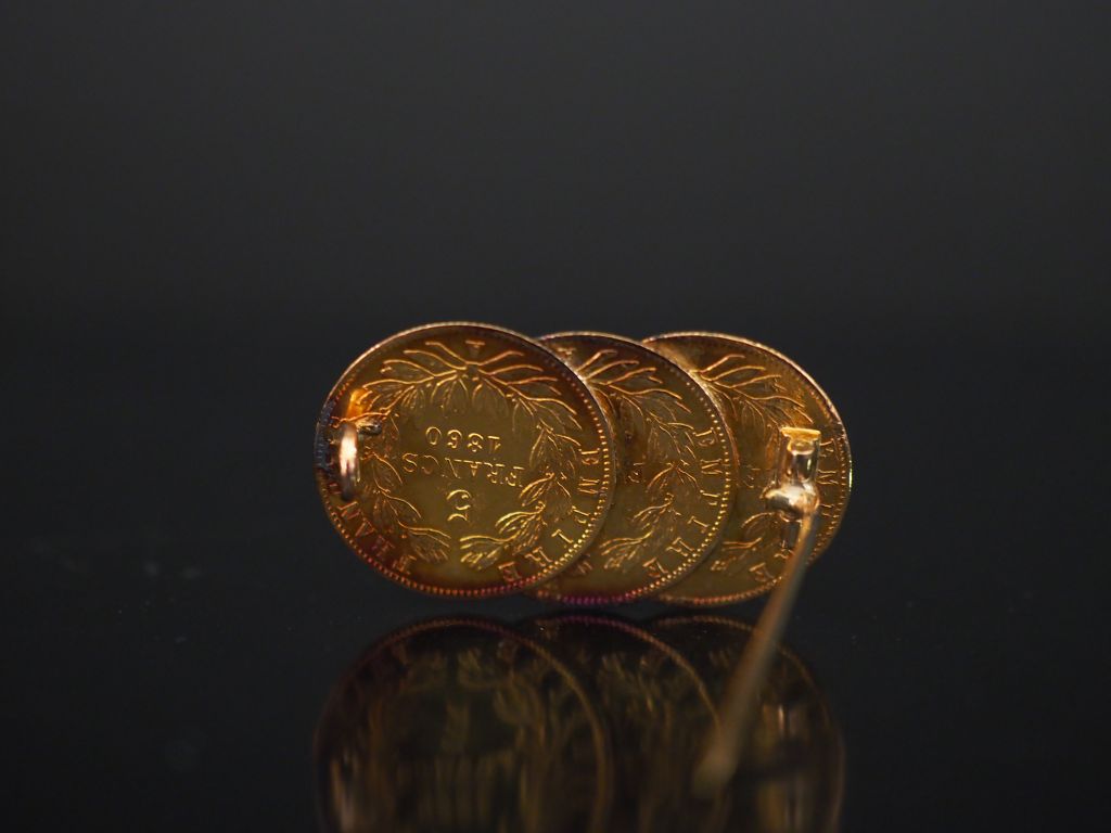 Broche en or jaune, sertie de trois pièces de 5 Francs or. Long. 3 cm ...
