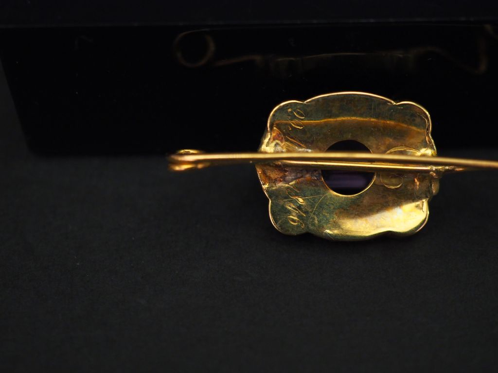 Broche en or jaune, sertie en son centre d’une améthyste. Poids tel. 4,67 g (enfoncement)