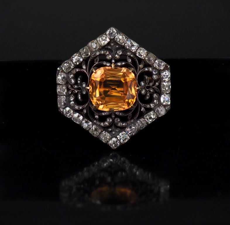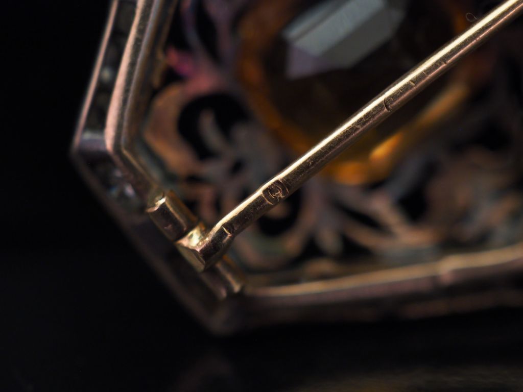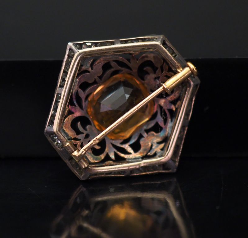 Broche hexagonale en or jaune et argent, à décor ajouré de rinceaux et sertie en son centre d'un quartz et de diamants taillés en rose. 3,1 x 3 cm Poids tel. 6,69 g