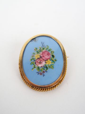 Lot de Broche monture or jaune, orné d'un émail décor de fleurs (accident). P au prix de 100 à 120 € en vente aux enchères par l'hôtel des ventes Primardeco