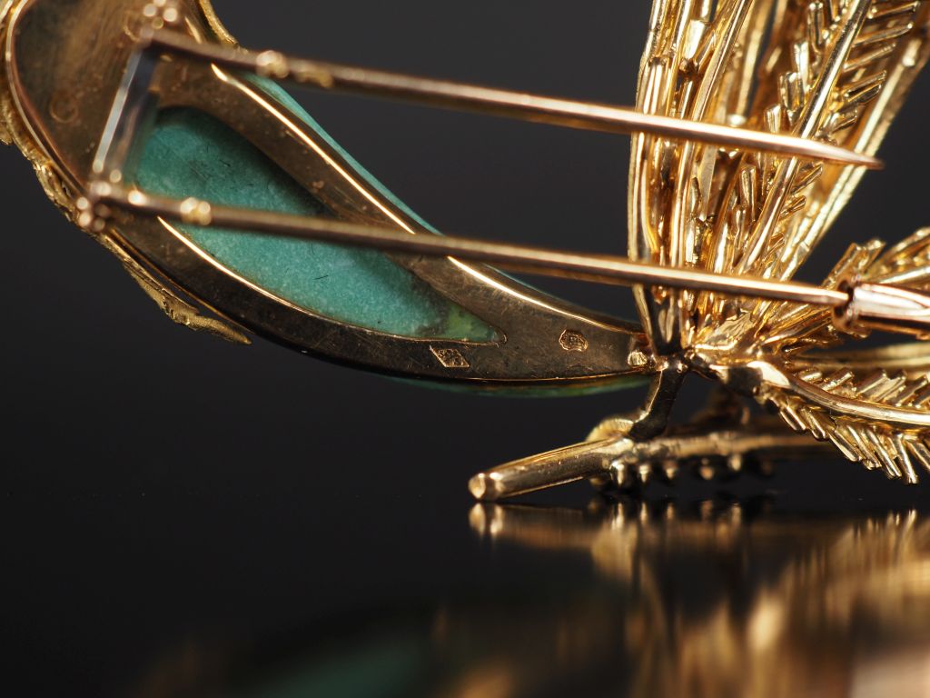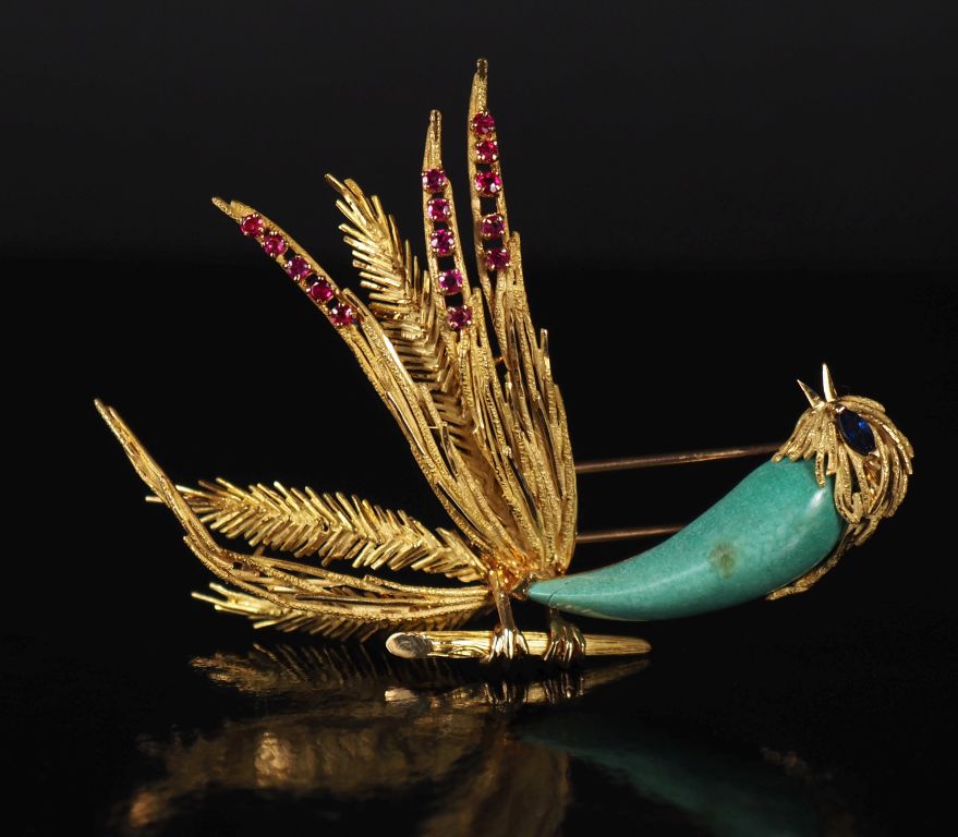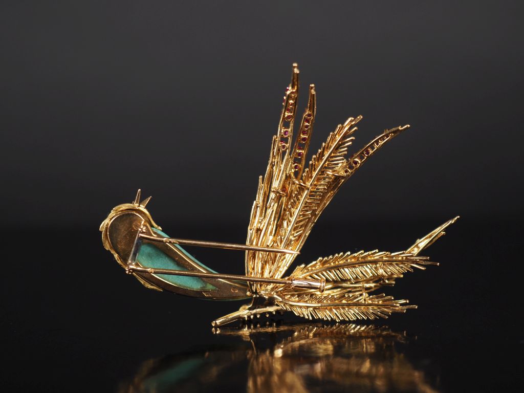 Broche oiseau de paradis en or jaune 750, le corps serti d'une pierre verte en cabochon de forme stylisée, les ailes agrémentés de petits rubis et l'œil orné d'un saphir. 5,3 x 7,3 cm Poids tel. 23,03 g (pierre accidentée)