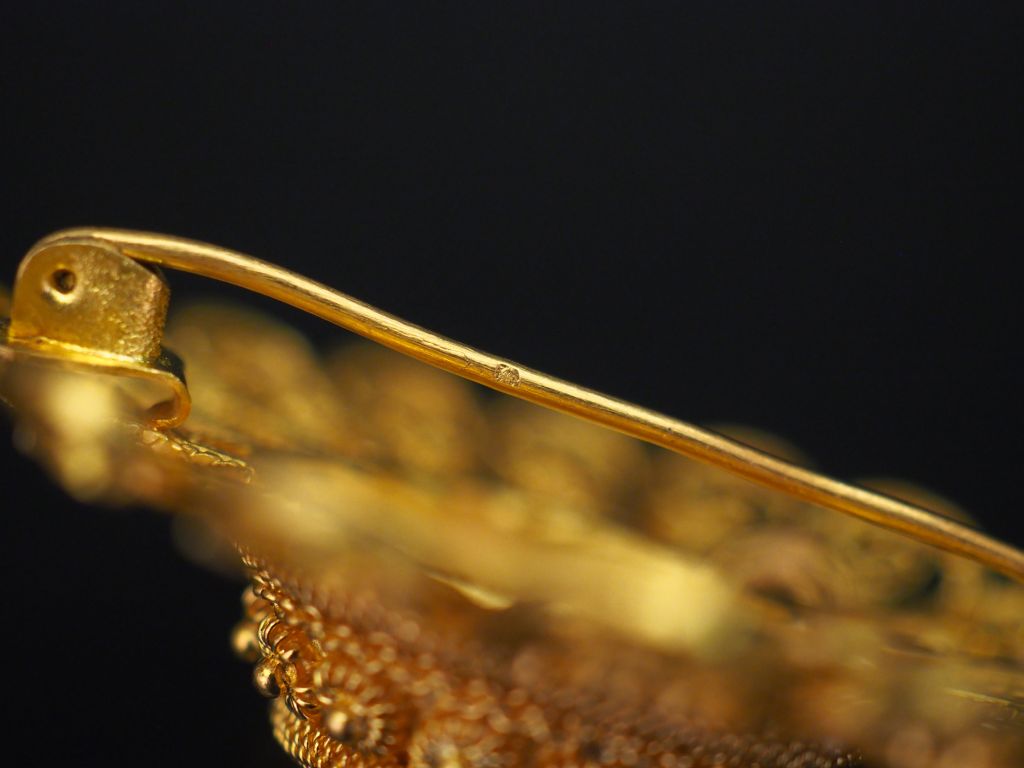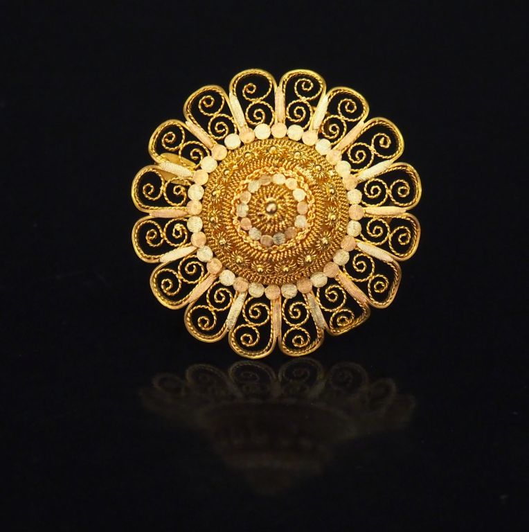 Broche/pendentif en forme de rosace deux tons d'or, à décor ajouré et filigrané. Diam. 5 cm Poids. 23,35 g (légèrement tordue à un endroit)