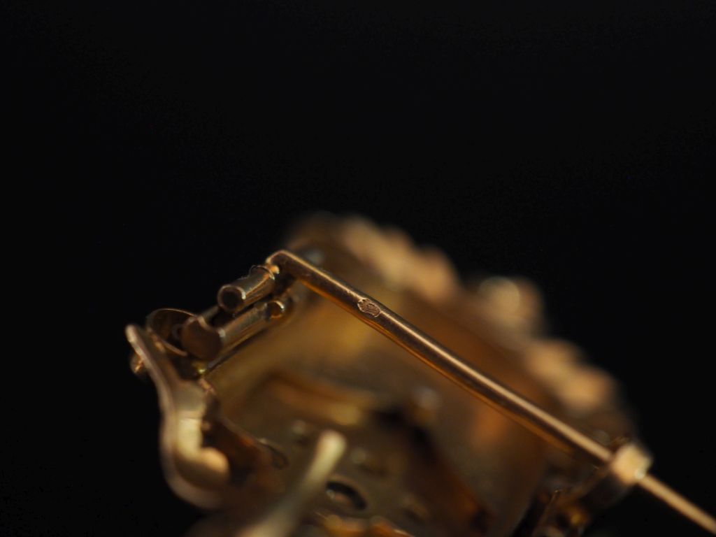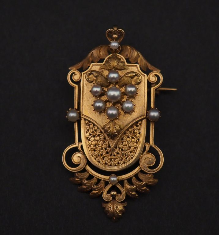 Broche/pendentif Napoléon III en or jaune 750, à décor ajouré de rinceaux et feuillage et agrémenté de demi perles blanches. 5,5 x 2,8 cm Poids tel. 11,90 g