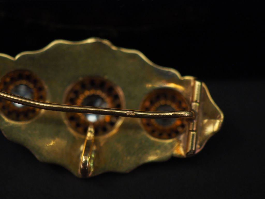 Broche polylobée Napoléon III en or jaune, à décor de rinceaux et sertie de trois diamants taillés en rose. Long. 4,5 cm Poids tel. 8,39 g