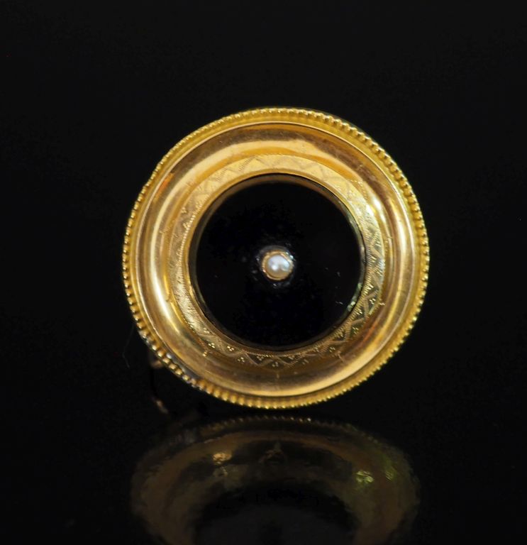Broche ronde Napoléon III en or jaune 750, onyx noir et sertie en son centre d'une demi perle blanche. Diam. 3,5 cm Poids tel. 4,60 g (pique tordue, petits enfoncements, accident et restauration)