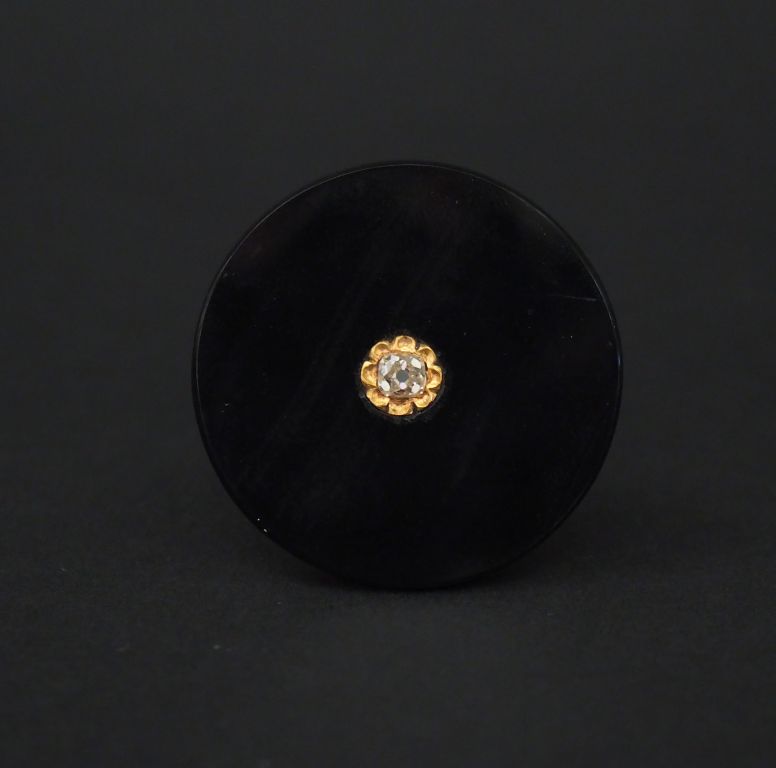 Broche ronde Napoléon III en or jaune et onyx noir, sertie en son centre d’un diamant taille ancienne. Diam. 3,6 cm Poids tel. 14,14 g