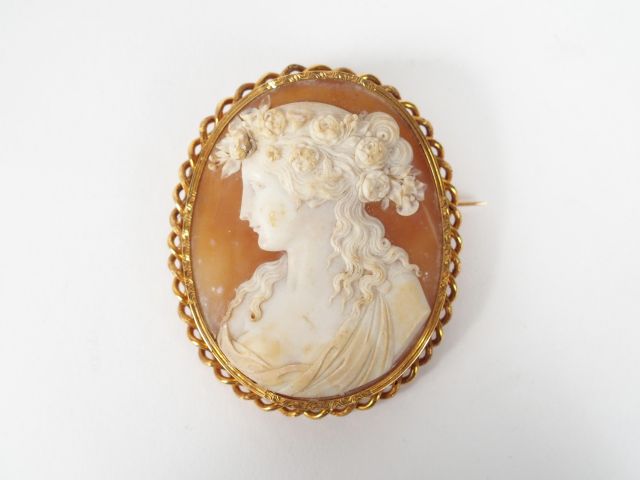 Lot de Camée coquille monture or jaune "Profil de jeune femme". 6 x 5cm au prix de 200 à 300 € en vente aux enchères par l'hôtel des ventes Primardeco