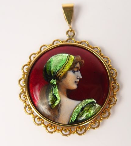 Camille Fauré, Limoges. Médaillon pendentif en émail à décor d’une gitane. Entourage en or jaune. Signé. Poids tel : 6.2 g