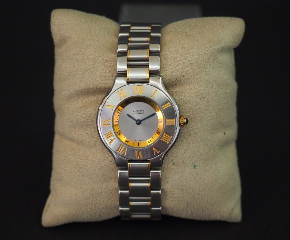 CARTIER, Must 21 Montre bracelet de dame en acier et métal doré. Cadran rond à chiffres romains pour les heures et arabes pour les minutes. Le remontoir serti d'une pierre bleue en cabochon. Bracelet articulé en acier et métal doré à boucle déployante. Signée sur le cadran, au revers et sur le bracelet. Référence : 1330 / PL332941. Diam. 32 mm Dans sa boite.