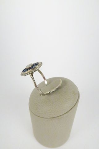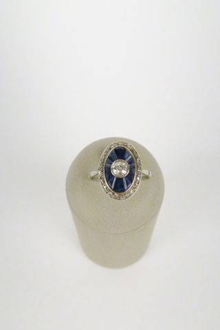 CC-Bague marquise en or blanc de style Art Déco, diamant central de taille ancienne entouré de saphirs calibrés et de roses
