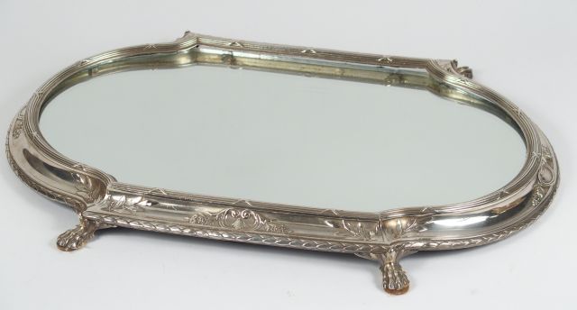 Centre de table à fond de glace de style Louis XVI en métal argenté, à décor de nœuds de ruban, de frise de laurier et de feuillage, reposant sur 4 pieds griffes. Longueur à la base : 52,5 cm
