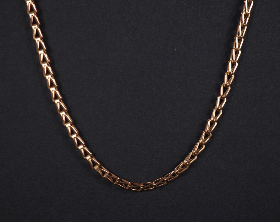 Chaine en or jaune 750, maille fantaisie triangulaire. Long. 47,5 cm Poids. 6,90 g (fermoir à revoir)