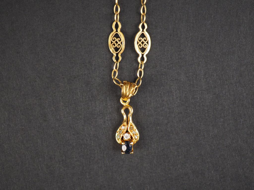 Chaine en or jaune, à décor de médaillons filigranés. Long. 46 cm Poids. 5,05 g On y joint un pendentif en métal doré et pierres fantaisie.