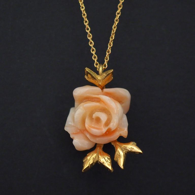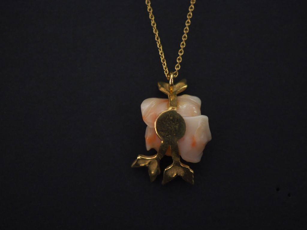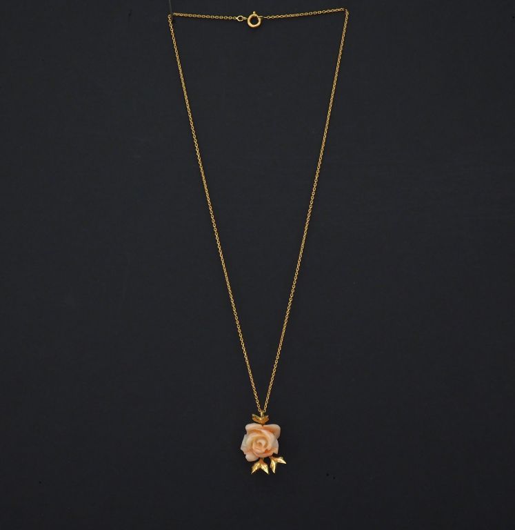 Chaine en or jaune, maille forçat, et son pendentif en or jaune et corail en forme de fleur épanouie. Long. 37,5 cm H. du pendentif : 2,5 cm Poids tel. 5,17 g (manque au niveau d'un pétale)