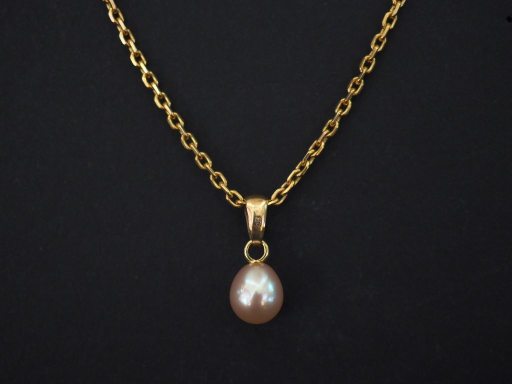Chaine en or jaune, maille forçat, et son pendentif en or jaune et perle rosée. Long. 41,5 cm H. du pendentif : 0,8 cm Poids tel. 6,38 g