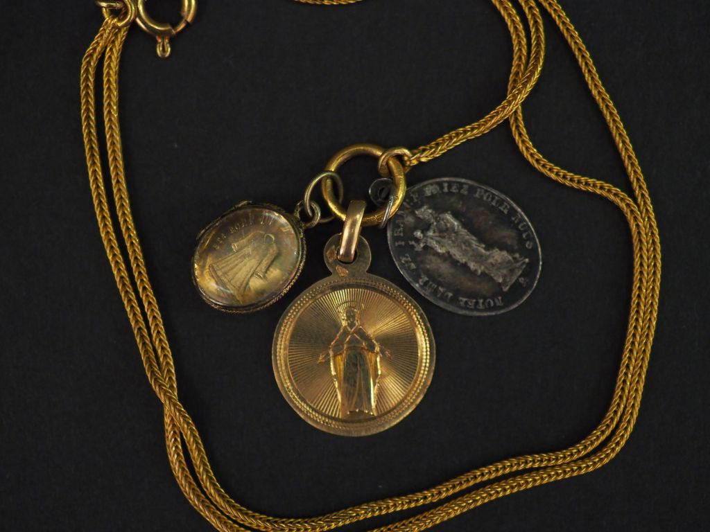 Chaine en or jaune, maille ronde. Le fermoir orné de trois différentes médailles religieuses dont une en or jaune. Long. 40 cm Poids tel. 5,66 g (environ)