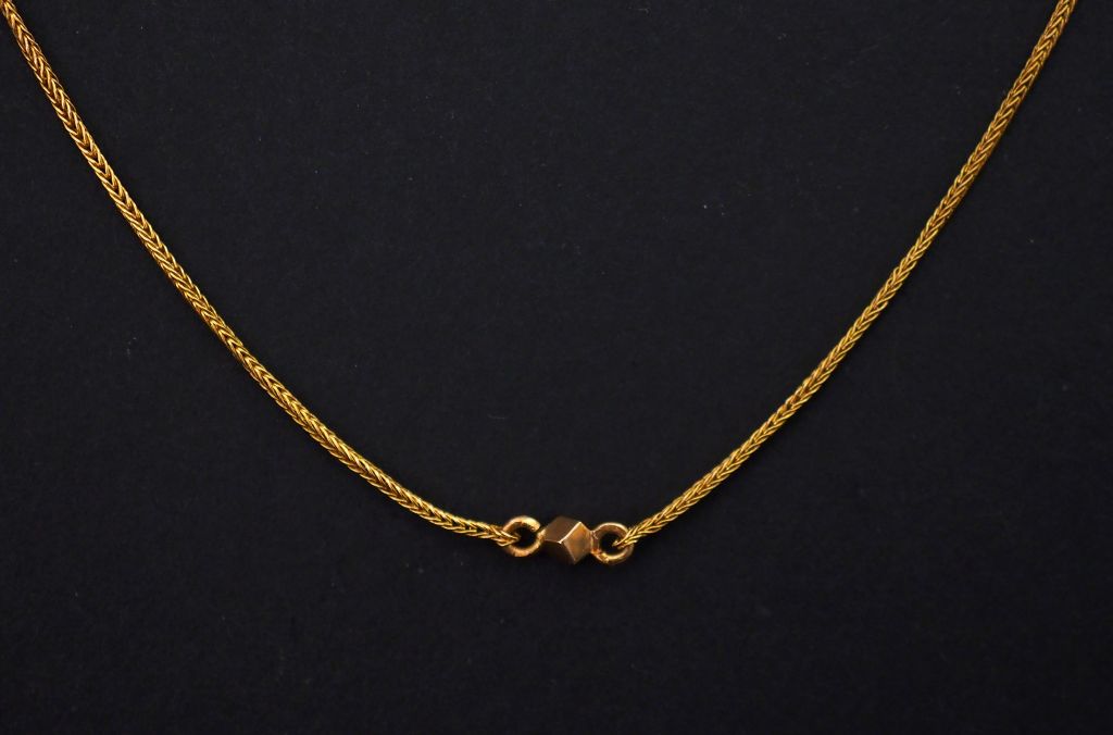 Lot de Chaine en or jaune, maille tressée, agrémentée de trois motifs de cube au prix de 80 à 100 € en vente aux enchères par l'hôtel des ventes Primardeco