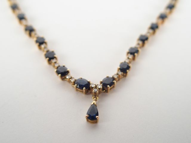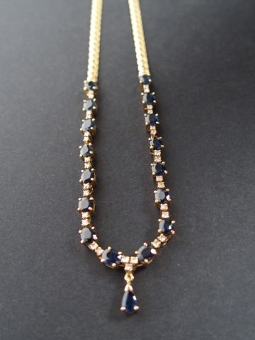 Chaîne maille plate en or jaune ornée de 16 saphirs tailles émeraude de 0,30 cts environ alternés de brillants. 39cm environ, 16,3gr tel