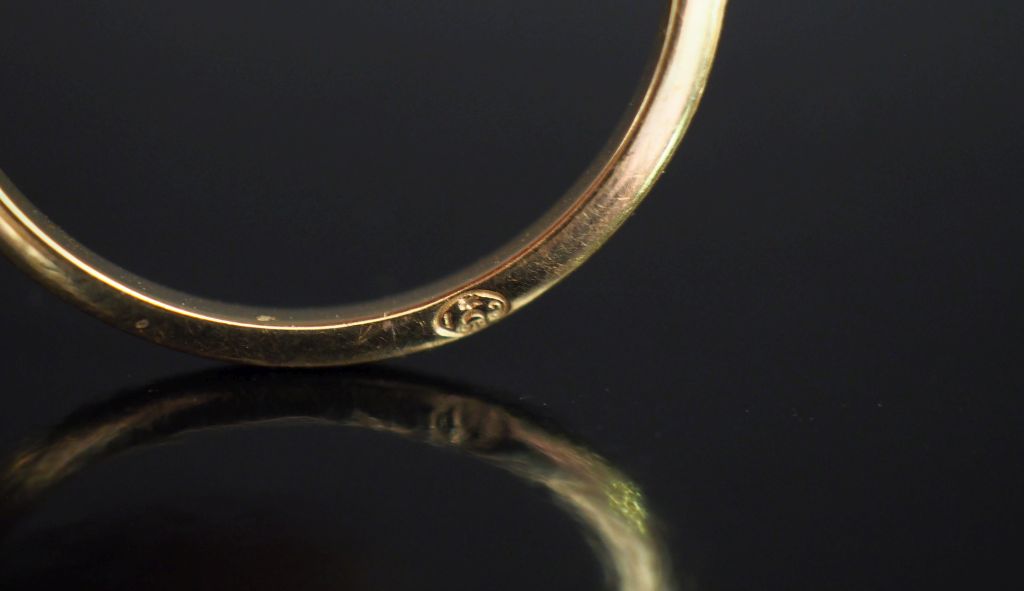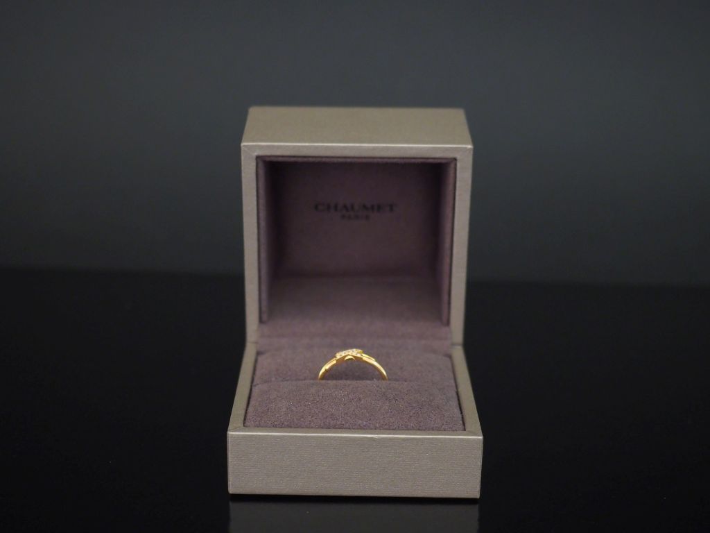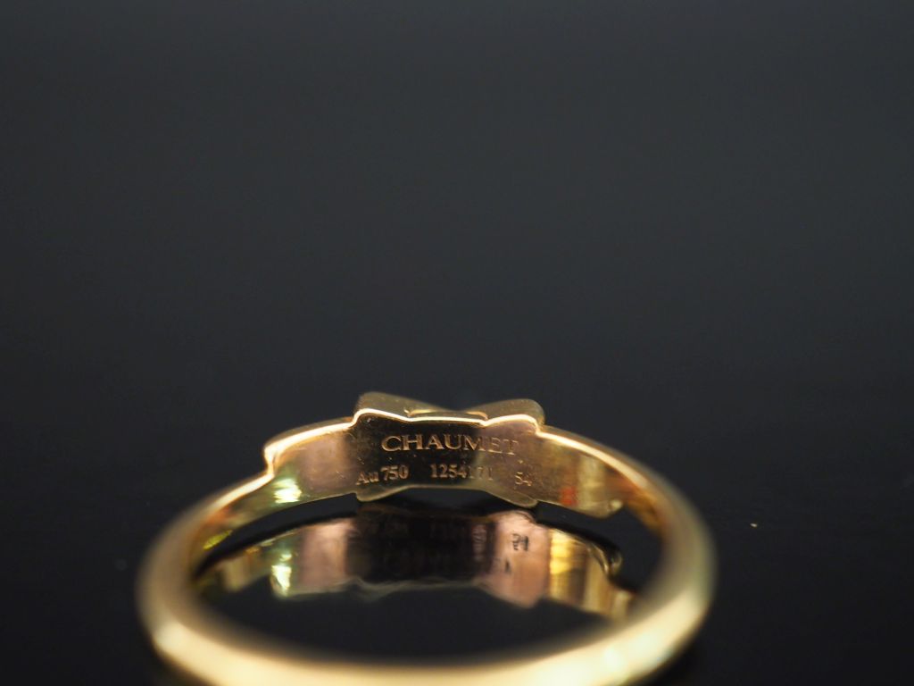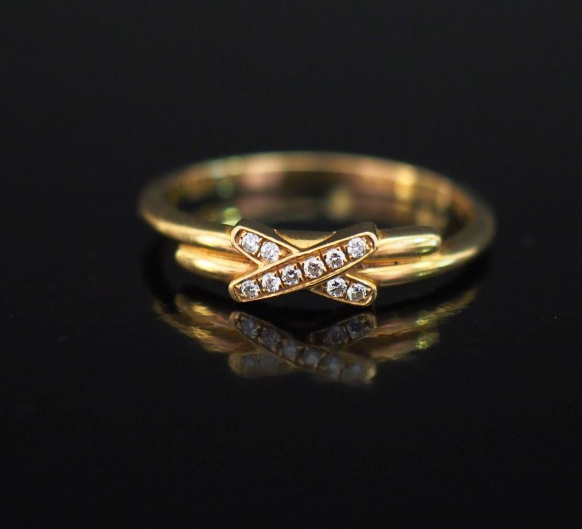 CHAUMET, Bague "Jeux de liens" en or june 750, sertie en son centre de dix petits diamants. TDD. 54 Signée. Numérotée 1254171. Poids tel. 2,25 g Dans son écrin d'origine.