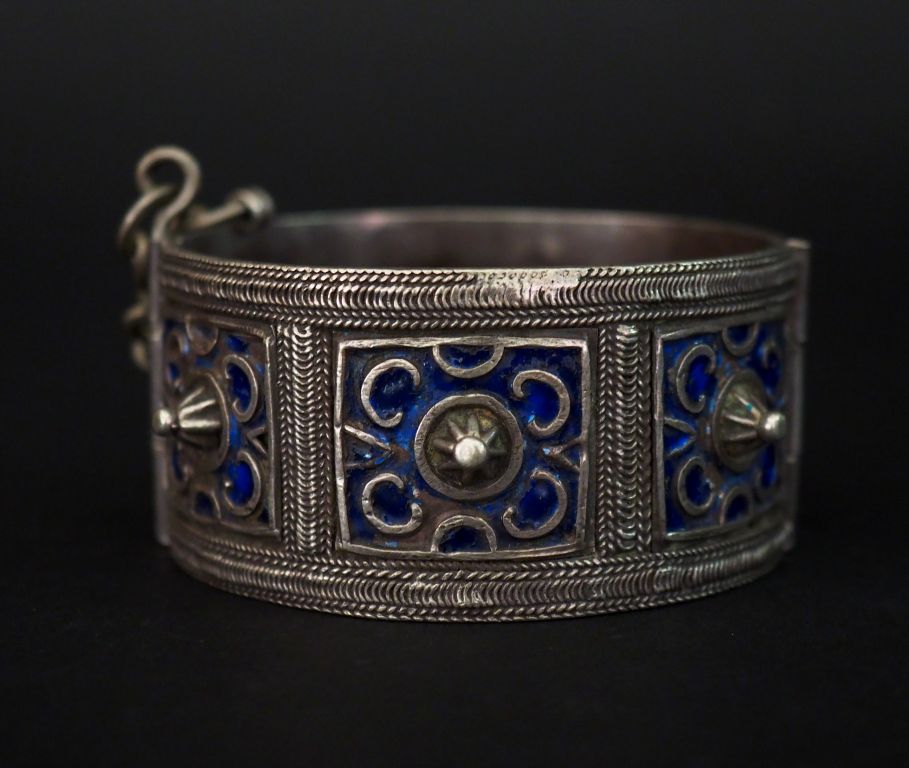 Chevillère d'enfant Afrique du Nord en argent rehaussé d'émail bleu. Diam. 6,4 cm Poids tel. 98 g (sauts d'émail)