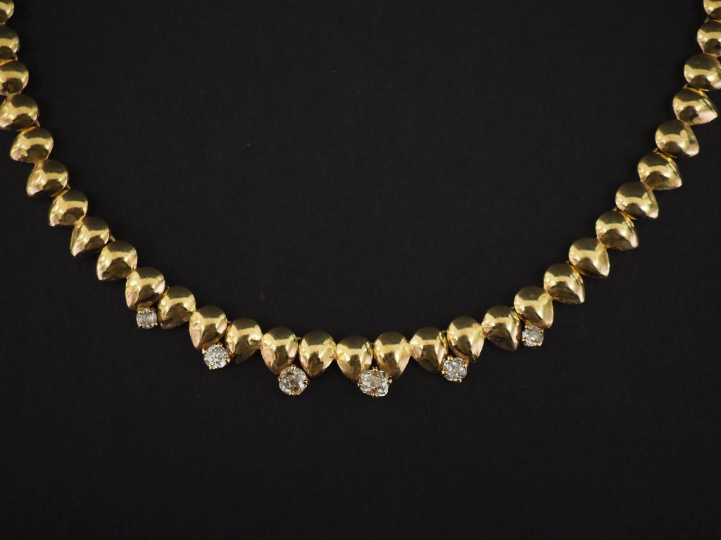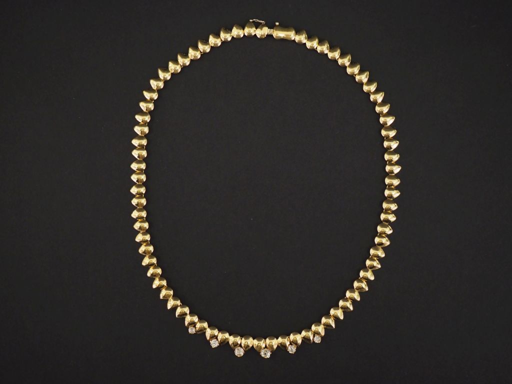 Collier articulé en or jaune 750, composé de maillons pastilles et agrémenté de six diamants taillés en rose. Diam. 12,5 cm environ Larg. 0,7 cm Poids tel. 41,21 g