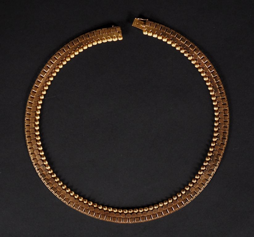 Collier articulé en or jaune 750, maille plate fantaisie, agrémenté en bordure d'une rang de motifs filigranés. Larg. 1 cm Long. 43,5 cm Poids. 48 g