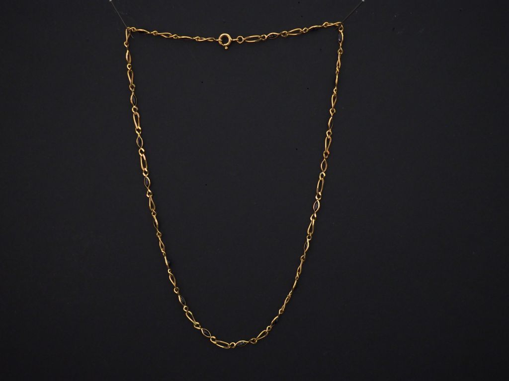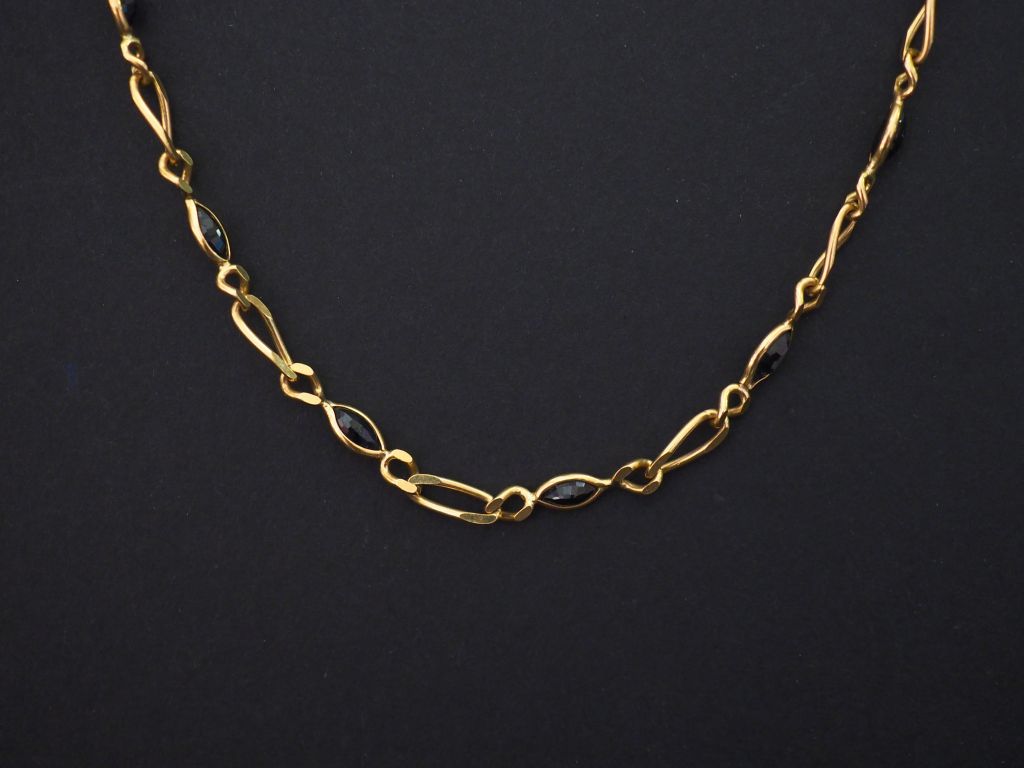 Collier articulé en or jaune, maille cheval alternée de maillons sertis de pierres bleues. Long. 42 cm Poids tel. 7,40 g