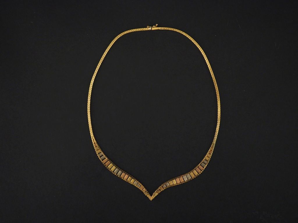 Lot de Collier articulé trois tons d'or, maille plate, se terminant en pointe au prix de 600 à 700 € en vente aux enchères par l'hôtel des ventes Primardeco