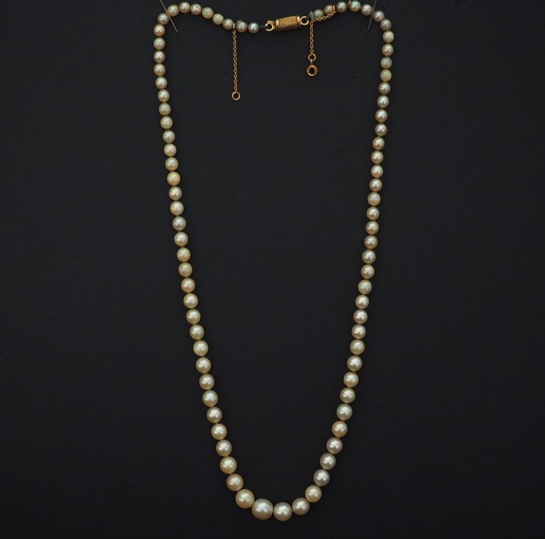 Collier de perles blanches disposées en chute. Fermoir de forme cylindrique en or jaune. Chainette de sécurité. Long. 48 cm Poids tel. 19,40 g (petits enfoncements au fermoirs)