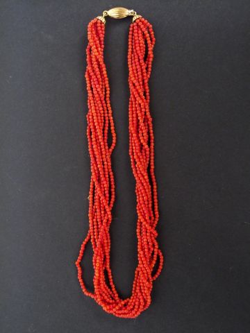 Collier de perles de corail en torsade, fermoir or jaune.