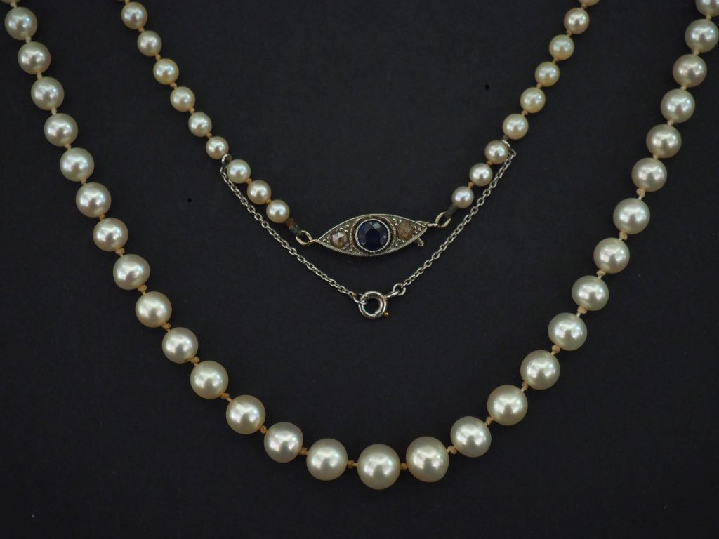 Collier de perles de culture blanches disposées en chute. Fermoir en or blanc 750, sertie en son centre d'une pierre bleue épaulée de deux diamants taillés en rose. Chainette de sécurité. Long. 51 cm Poids tel. 12,61 g