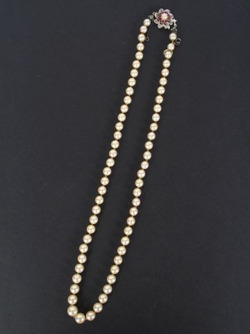 Collier de perles de culture disposées en chute de 5,6mm à 7,9mm. Fermoir or blanc en forme de fleur rehaussé d'une perle et de rubis. 46cm