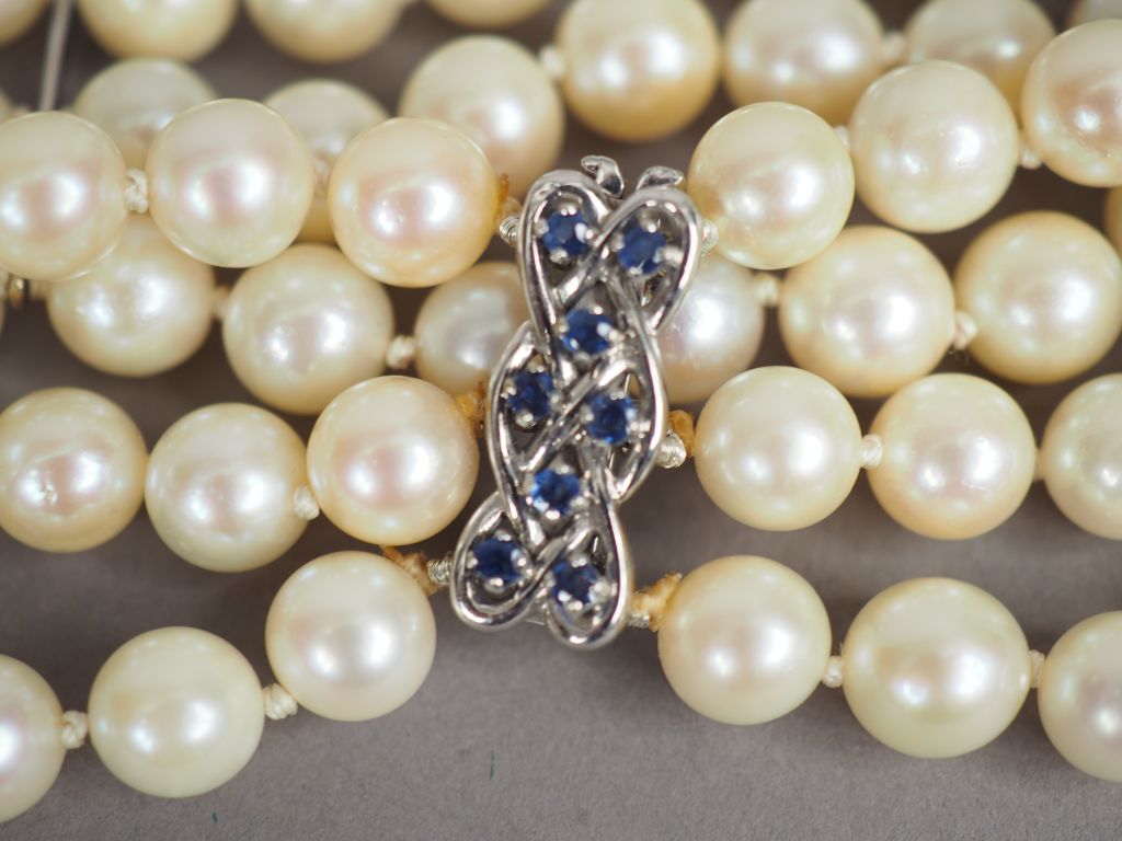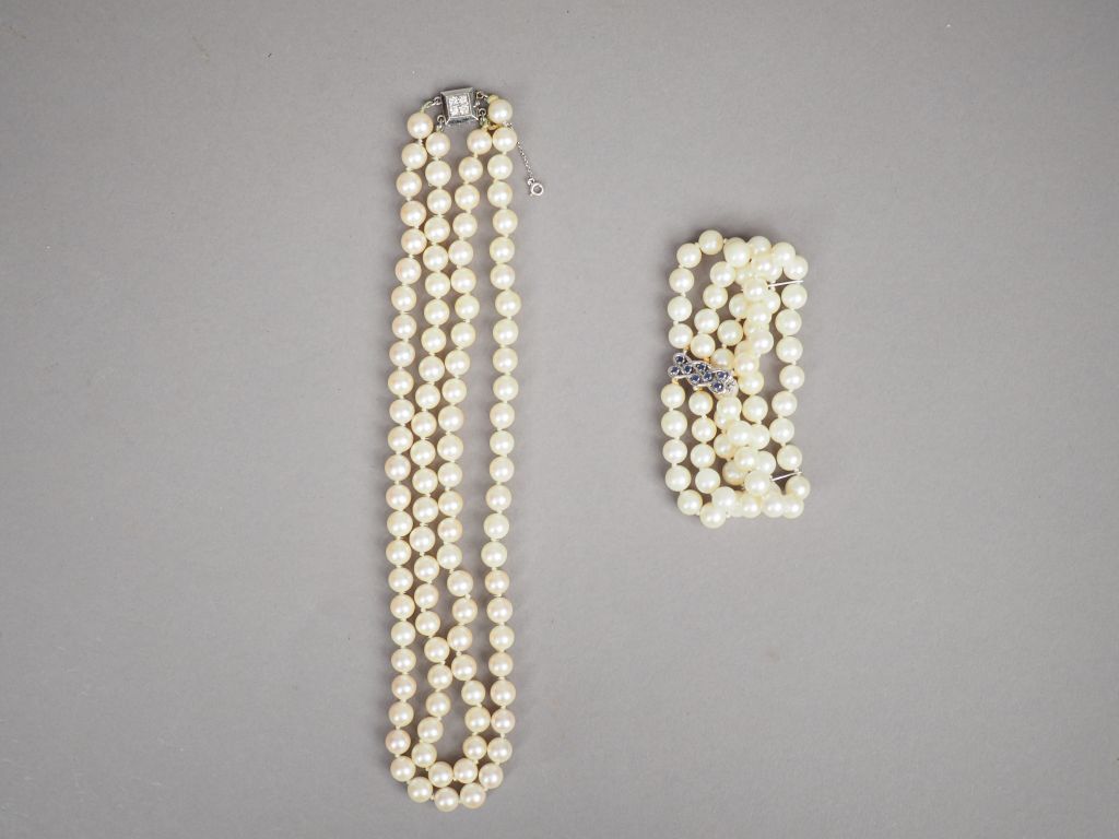 Collier de perles de culture double rangs. Fermoir en or blanc orné de quatre petits diamants. On y joint un bracelet de perles de cultures triple rangs. Fermoir en or blanc orné de pierres bleue.