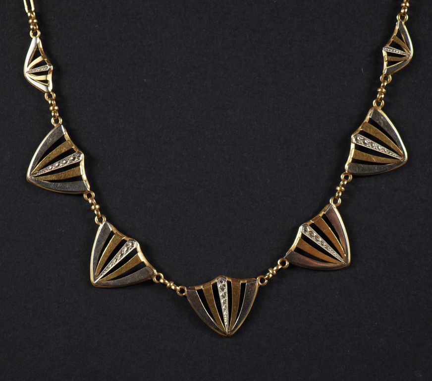 Collier draperie deux tons d'or 750, maillons rectangulaires forçat, à décor de sept maillons ajourés. Long. 44 cm Poids. 10,24 g