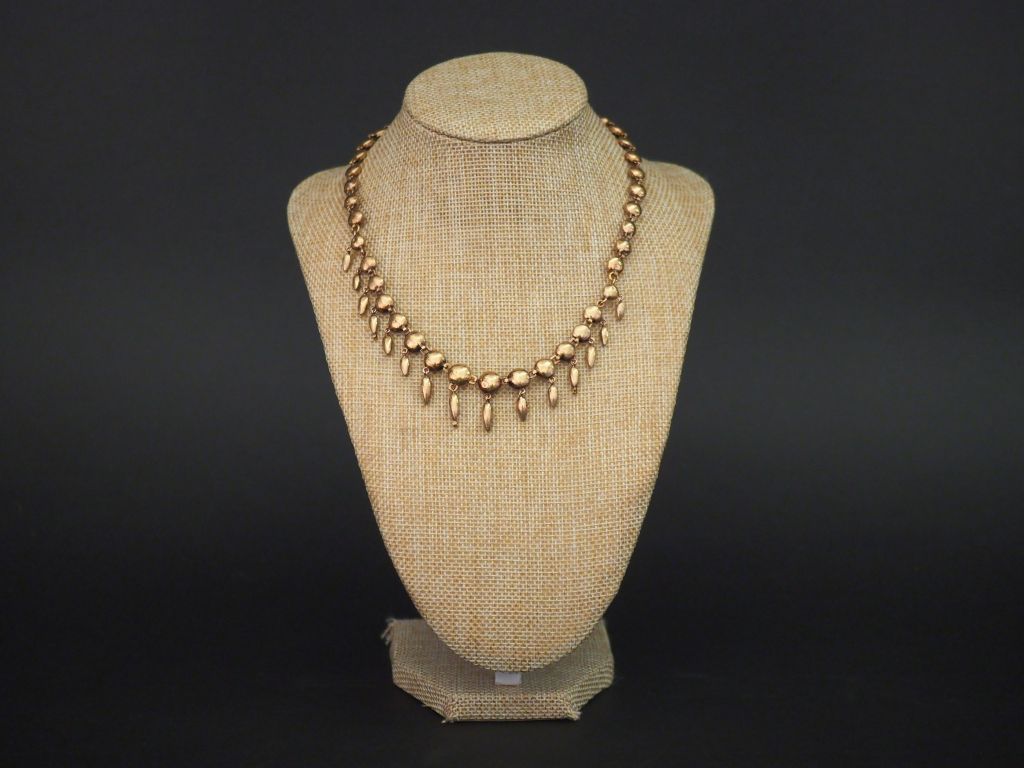 Collier draperie en or jaune et grenats disposés en chute et agrementés pour certains de pendeloques. Long. 41 cm Poids tel. 27,02 g (petit manque à la pendeloque du centre)