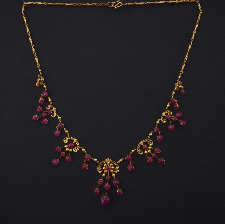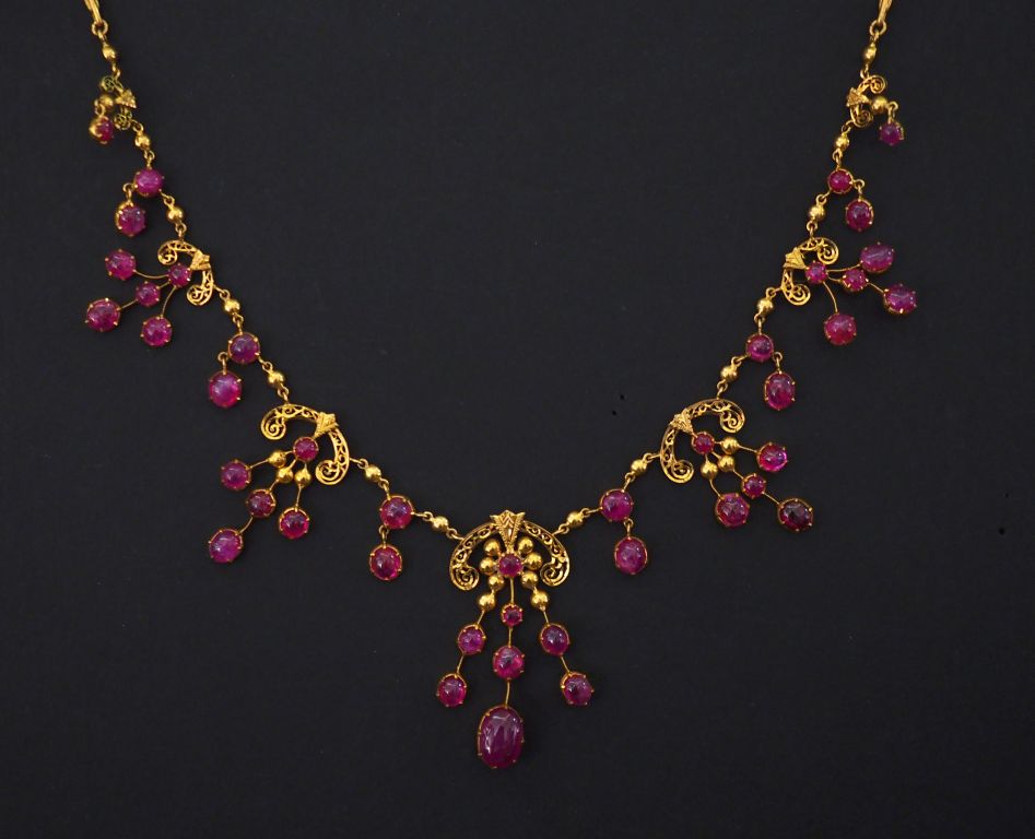 Collier draperie en or jaune,orné de pendeloques serties de petites pierres roses en cabochon. Dim. du motif central : 4 x 20 cm Long. 47,5 cm Poids tel. 21,72 g