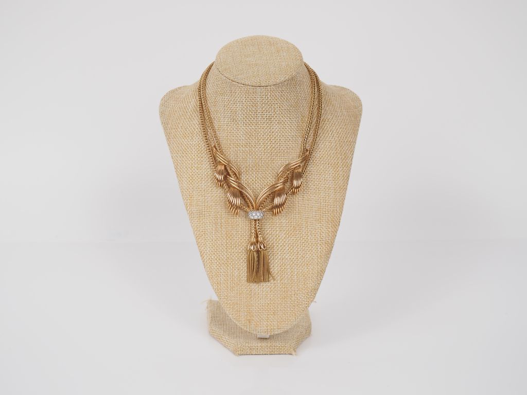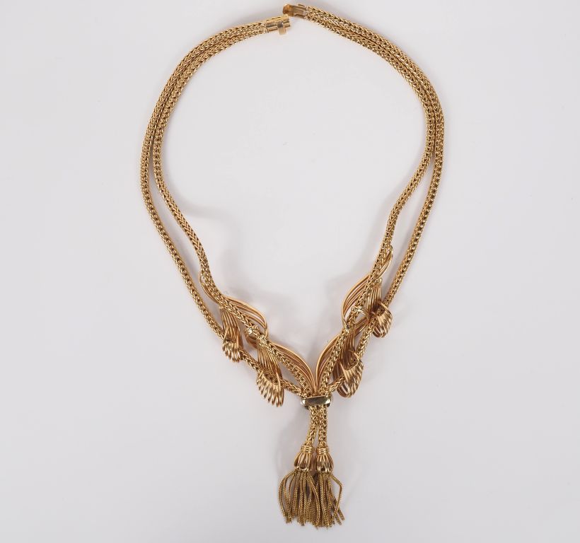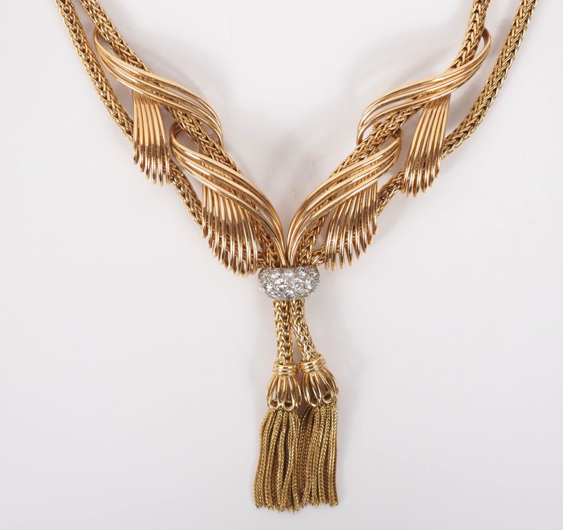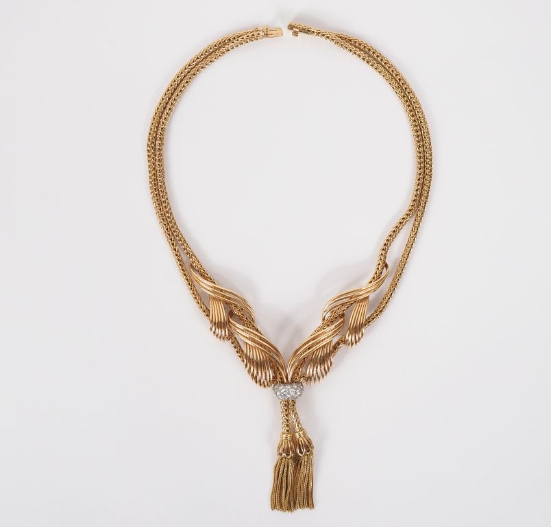 Collier draperie en platine et or jaune 750. Double brins, maille ronde tressée, agrémentés de motifs d'entrelacs ajourés et d'un anneau serti de petits diamants, se terminant par deux pompons en pendeloque. Long. 32 cm Poids tel. 92,30 g