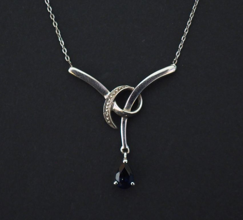Collier en or blanc 9k, orné en son centre d'un motif abstrait serti d'une pierre bleu en pendeloque en forme de goutte. Long. 42,5 cm Dim. du motif central : 2,5 x 2,5 cm Poids tel. 1,99 g