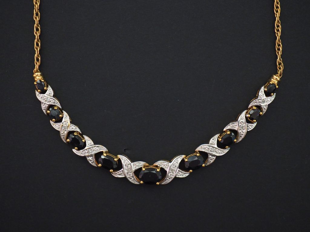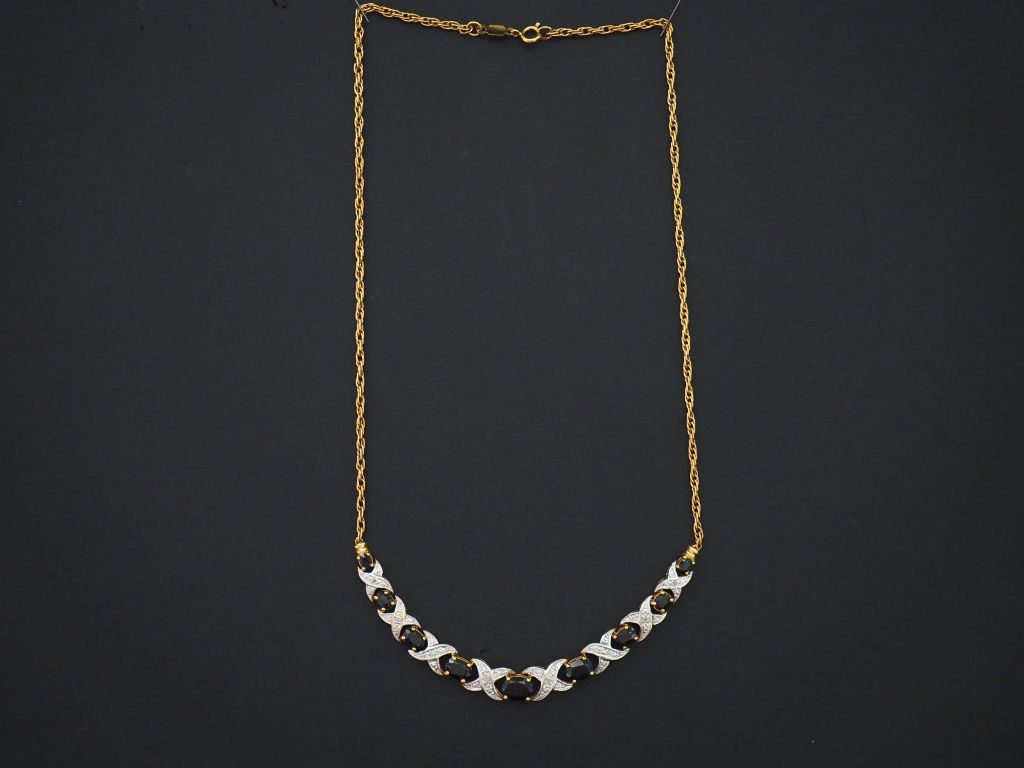 Collier en or jaune 9K, retenant des motifs tressés sertis en leur centre d’un éclat de diamant alternés de neuf pierres bleu foncé disposées en chute. Long. 44 cm Poids tel. 15,67 g