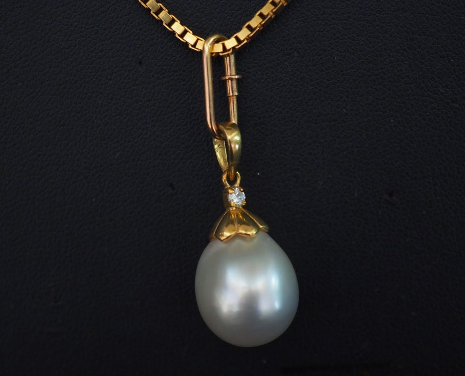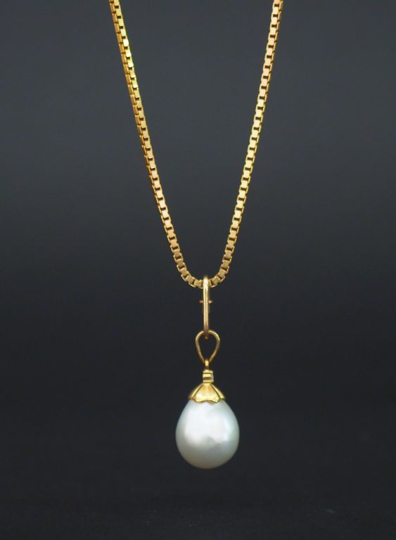 Collier en or, maille carrée ajourée. Poids : 19,10 g et pendentif perle baroque petit brillant. 5,60 g