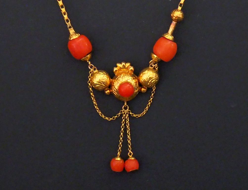 Collier Napoléon III en or jaune, agrémentée de perles de corail, à décor d'un motif central retenant deux perles de corail facettées en pendeloques. Long. 40 cm Poids tel. 12,93 g