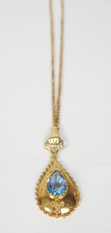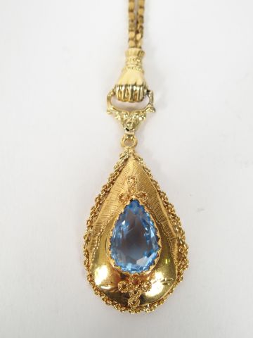Collier or jaune Napoléon III, maille tube, bélière en forme de main tenant un pendentif orné en son centre d’une pierre bleue taille poire. 45cm environ Poids tel : 12,6gr