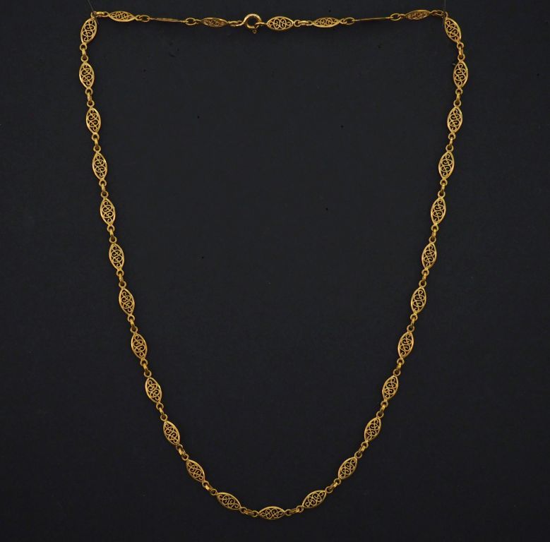 Collier souple en or jaune 750, composé de maillons ovales ajourés et filigranés. Long. 50,5 cm Poids. 10,37 g